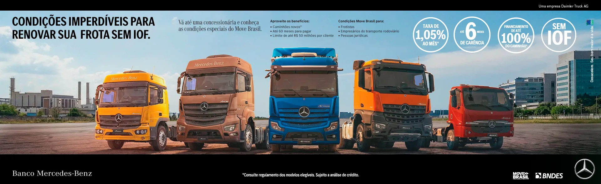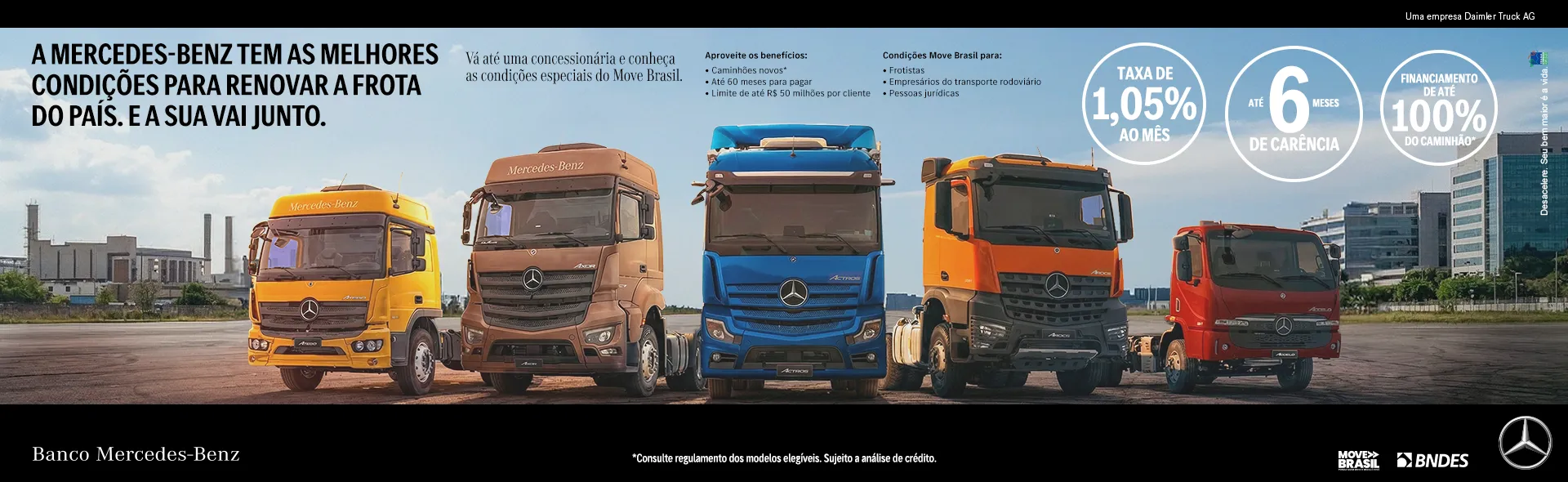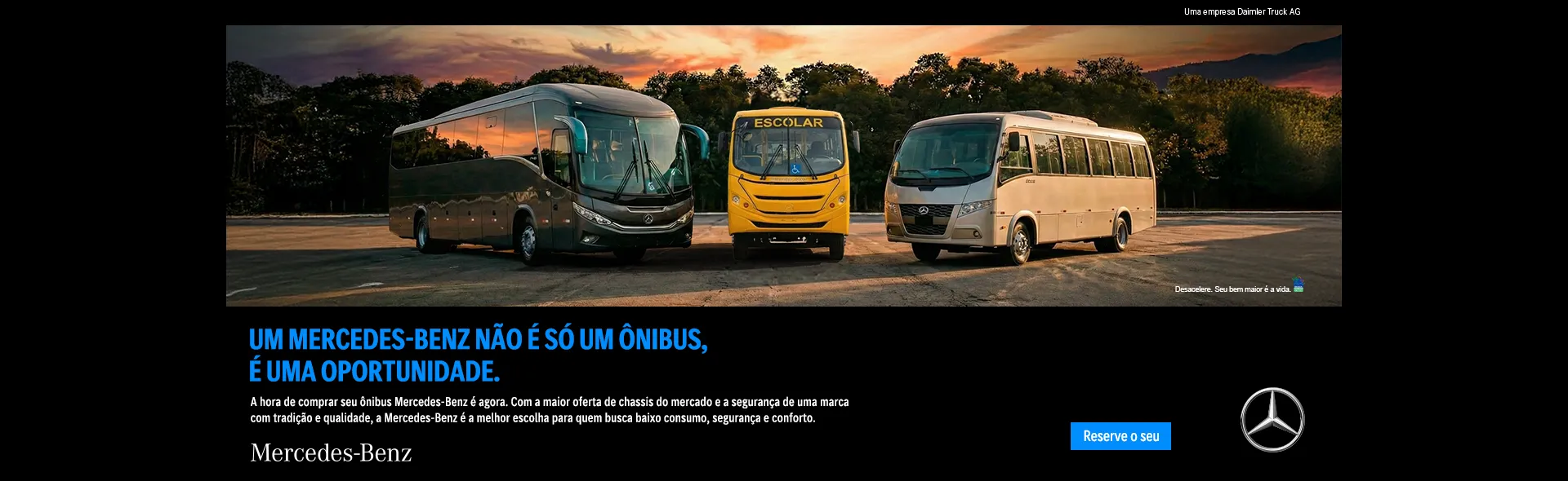 A Mercedes-Benz se orgulha em fazer parte da história do Brasil desde 1956. Participamos ativamente no desenvolvimento do país, gerando empregos, investindo em qualidade e tecnologia. Nossos produtos mexem com a imaginação das pessoas e são uma referência de modernidade, sofisticação e segurança.
