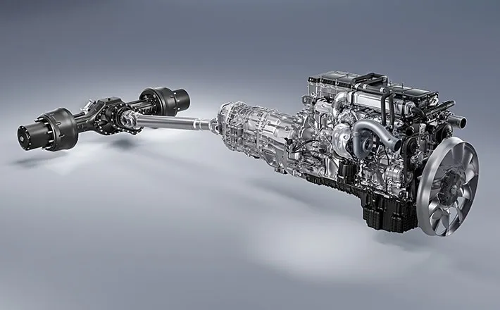 Eficientes e confiáveis motores asseguram desempenho e economia de combustível. Inteligentes câmbios automatizados proporcionam trocas de marchas rápidas e precisas trazendo melhor desempenho, economia e conforto ao dirigir. Os eixos traseiros trazem leveza e eficiência na versão sem redução nos cubos e força e resistência na versão com redução nos cubos. Totalmente fabricado pela Mercedes-Benz, força e robustez estão presentes em todo o trem de força.