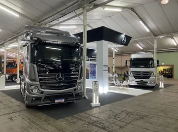 - Extrapesados Actros e Axor para transporte de grãos, cana-de-açúcar e madeira, juntamente com o semipesado Atego para diversas operações no setor, estão expostos no estande da marca