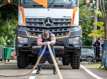 - Homens mais fortes do mundo foram desafiados a puxar o Arocs por 15 metros – canadense Jean-François Caron foi o grande vencedor da prova e de toda a competição