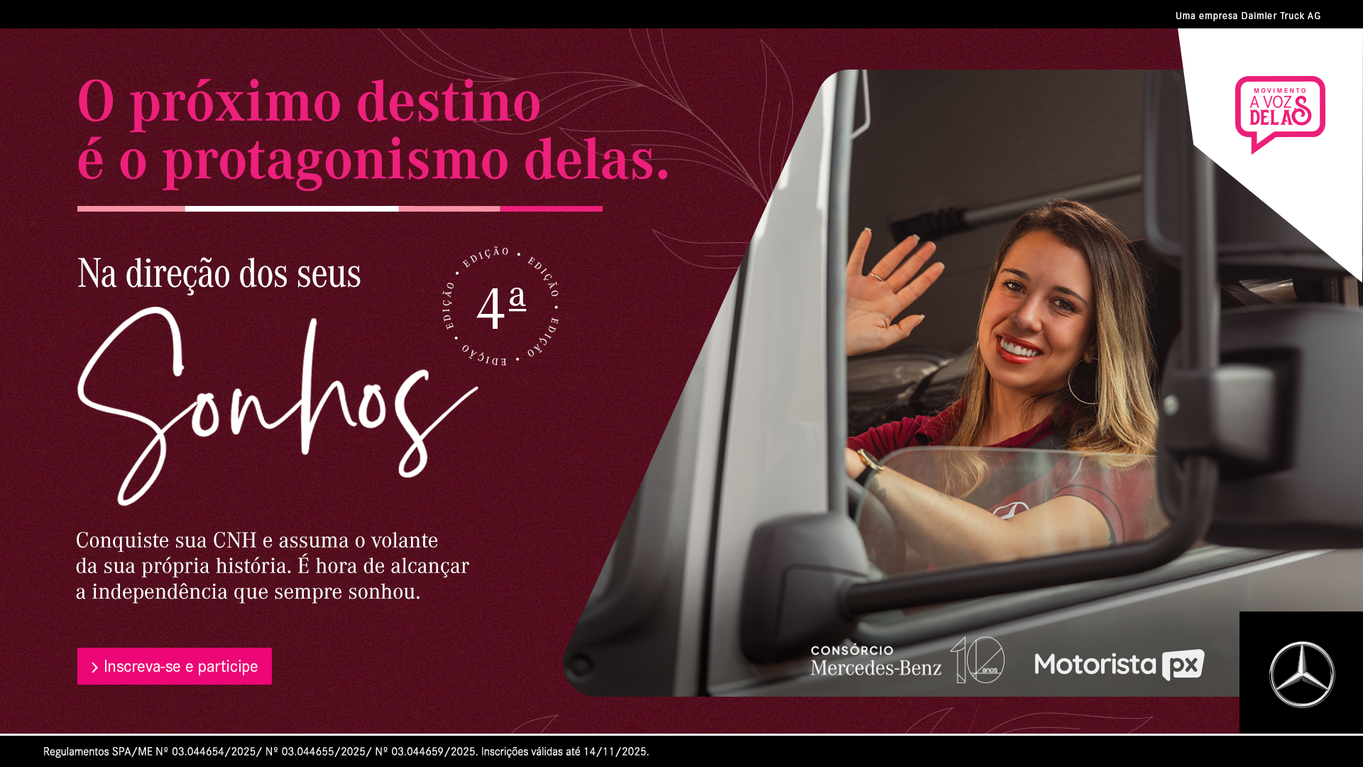 “Lançado em fevereiro de 2019, o Movimento A Voz Delas conta hoje com mais de 70 empresas parceiras somando forças para a transformação no cenário do transporte para a mulher”, informa Marcos Andrade. “Um total de 46 mulheres realizaram o sonho da CNH profissional por meio das três edições da promoção ‘Na Direção dos Seus Sonhos’ já realizadas. Isso é motivo de muito orgulho e satisfação para nós. E assim, a Mercedes-Benz, o Movimento A Voz Delas e as empresas parceiras seguem em busca de mais mulheres no transporte, trabalhando em conjunto para trazer melhorias no segmento e também para elas”.