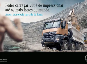 Caminhão extrapesado basculante, o Mercedes-Benz Arocs 8x4 veio revolucionar as operações fora de estrada no Brasil, sendo indicado para mineração, construção civil pesada e grandes obras de infraestrutura. O modelo tem capacidade técnica para até 58 toneladas de PBT – peso bruto total e 150 toneladas de CMT – capacidade máxima de tração, conforme as condições de operação. Ele está preparado para receber básculas de 20 a 24 metros cúbicos de capacidade volumétrica de carga.
