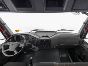 Para uma dinâmica ainda maior do caminhão, a Mercedes-Benz também se concentrou em todo o trem de força: a nova transmissão automatizada PowerShift Advanced permite deslocamentos e acelerações mais rápidos e suaves em muitos cenários, graças à seleção de marchas ainda mais precisa, resultando em menor consumo de combustível e maior conforto de dirigibilidade.