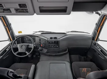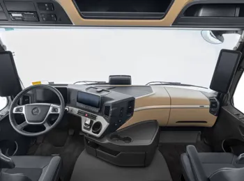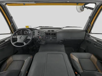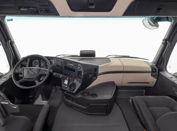 A nova linha Actros também tem novidades em sua cabina. Agora, são oferecidos aos clientes o painel de instrumentos digital com tela principal de 12 polegadas, para a cabina atual Top Space, e o painel analógico da versão Space. Destaque ainda para os novos bancos pneumáticos nacionais, com revestimento de tecido e vinil, que elevam o conforto para o motorista, e o novo conjunto ótico de faróis em LED, opcional, que oferece maior luminosidade nas vias e estradas, além de maior durabilidade ao sistema.