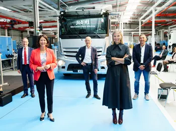 - Daniela Schmitt, Ministra da Economia e Transportes do Estado da Renânia-Palatinado, e Karin Rådström, Membro do Conselho de Administração da Daimler Truck AG responsável pela Mercedes-Benz Trucks, inauguraram juntas a nova linha de produção