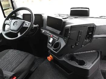 O interior da cabina do eActros foi projetado para oferecer máximo conforto e praticidade para o motorista. Destaque para painel LCD colorido com recursos de controle e segurança integrados (visão em tempo real da carga de bateria e indicador do nível de frenagem regenerativa, além de alertas e diagnósticos sem desvio de visão da estrada), display central multimídia sensível ao toque, anti-reflexo e com Bluetooth, volante multifuncional, botão start/stop, monitores da MirrorCam e porta celular, entre outros.