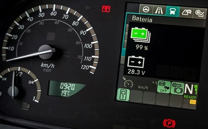 No eO500U, a indicação de nível de combustível foi substituída pelo nível de carga da bateria que também pode ser verificado no display. Já a indicação de medição de potência substituiu a indicação de rotação. Através de um display central, o motorista pode consultar o estado de carregamento da bateria, autonomia e outras inúmeras funções. O volante também é um multifuncional, os menus do painel de instrumentos são facilmente acessíveis através de teclas diretamente no volante. Quer seja indicação de estado ou luz indicadora, tudo é representado no display policromático de uma forma clara e nítida.